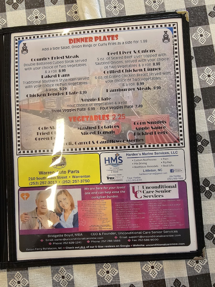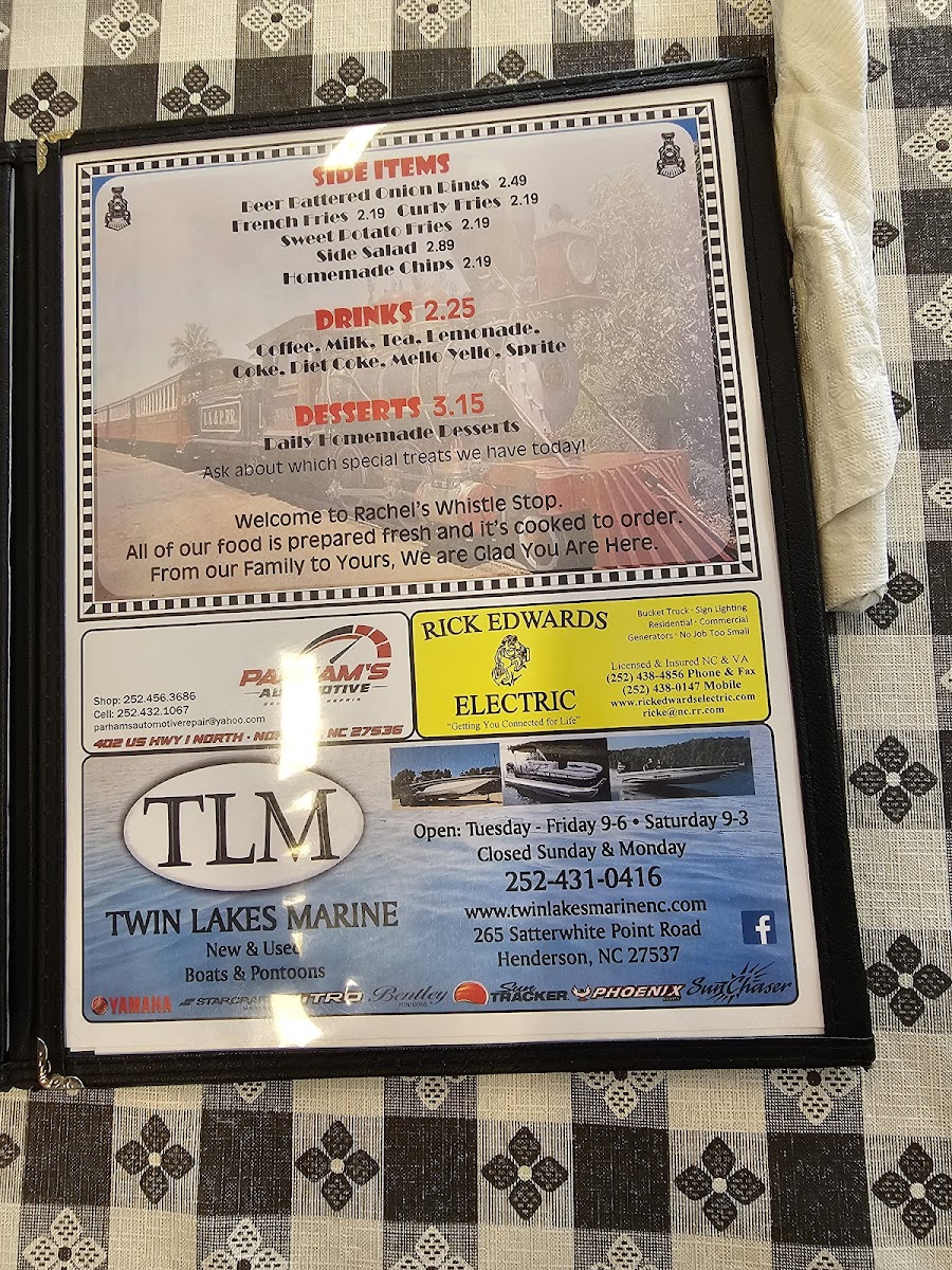 Overall, Rachel's Whistle Stop Cafe's menu provides a wonderful balance of comfort food, fresh ingredients, and tasty sides, making it a great choice for anyone looking for a satisfying meal in a relaxed atmosphere.