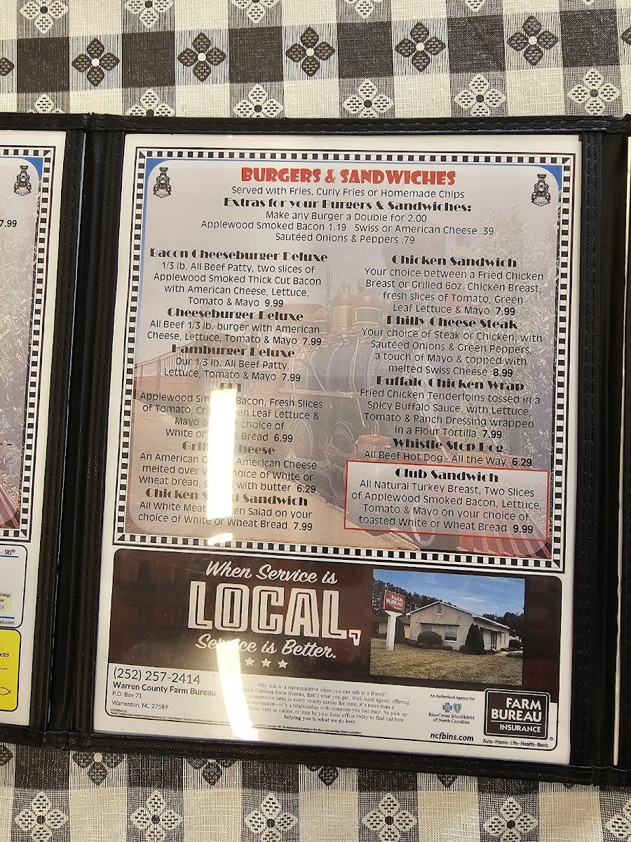 Rachel's Whistle Stop Cafe offers a delightful and diverse menu that caters to a wide range of tastes, perfect for a casual yet satisfying dining experience. The All Day Menu is structured to provide something for everyone, with hearty burgers and sandwiches like the classic Club Sandwich, Philly Cheese Steak, and Chicken Sandwich. For those seeking a simple yet fulfilling bite, the Grilled Cheese and Cheeseburger Deluxe are great options.